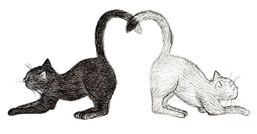 What feeling do you get from the center spread of the book, where the two stories merge, and the black cat and the white cat come together in the yin/yang configuration? Does this image make you think about love? Have you ever heard of the expression “my better half”? This is a phrase that is often used to describe a partner, husband or wife.